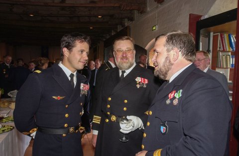 Billedet stammer fra Marinehjemmeværnets 50 års jubilæum i 2002, hvor receptionen blev afholdt på Nyborg Slot, og viser HKH Kronprinsen, KK Kurt Verner (nu formand i Nyborg MF) og KL Poul-Arne Callesen (nu formand i Sønderborg MF) under en hyggelig passiar omkring deres fællles øvelses- og sejladsoplevelser. Receptionen blev afsluttet med en frokost i marinestuen i Nyborg MF.