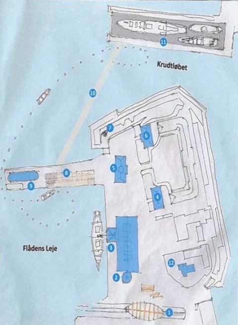 Billedtekst: 1. Galathea-bedding, 2. Planbygning til udstillinger og åbne magasiner, 3. Mastekranen, 4. Arresten, 5. Under Kronen (info butik og billettering), 6. Kommandantbygning med administration, 7. Batteriet Sixtus med Rigets Flag, 8. Elefanten frilægges under glas, 9., Toiletter og drift, 10. Tunnel eller el-færge, 11. Skibene, 12. OXA.