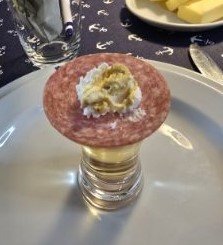 Alle blev budt velkommen med en lille velkomstdrink, "Ein Möwenscheisse", som er en dram, med et låg af pølse, peberrodssalat og sennep - det smager væsentligt bedre end det lyder, og ser ud!.