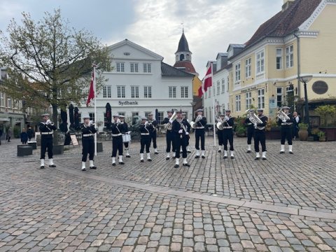 Søværnets Tamburkorps musicerede på torvet i Fåborg og i front for Sendemandsmødets deltagere, rundt i Fåborg.