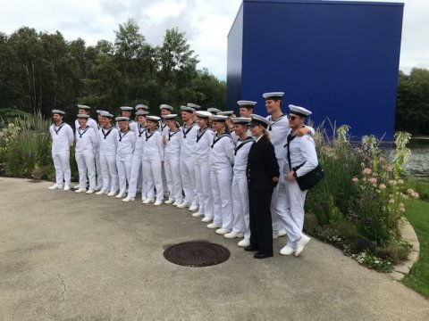 Besætningen fotograferet ved "Den blå kube" i Universe Science park. I forgrunden står dæks- og velfærdsofficer premierløjtnant Maria K. Ellyton.