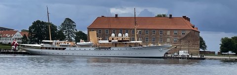 Kongeskibet Dannebrog på sin faste plads ved Slotsbroen, ud for Sønderborg Slot - et smukt syn der kan smelte et hvert maritimt hjerte!