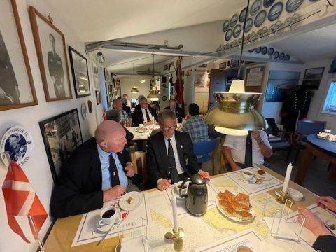 Efter besøget på Willemoesgården gik turen videre til Assens Marineforening, som på trods af ferielukning beværtede os fyrsteligt med godt kammeratskab, marinerede sild, mørbradbøf i fad og lækkert hjemmebag til kaffen - i sandhed en fortræffelig forstrækning, og som blev godt modtaget.